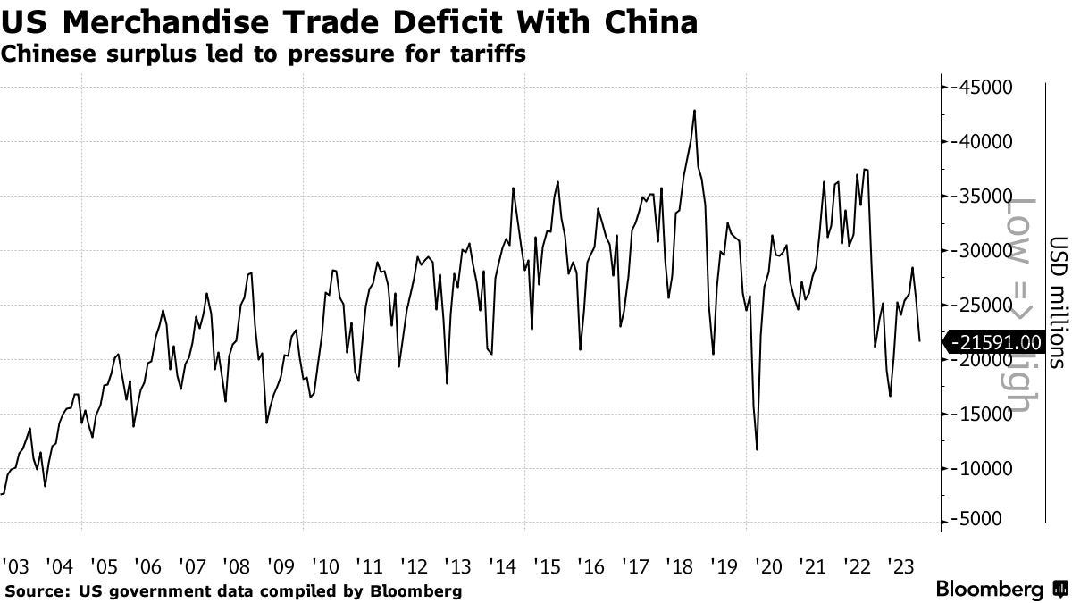 The US trade deficit with China remains very high: