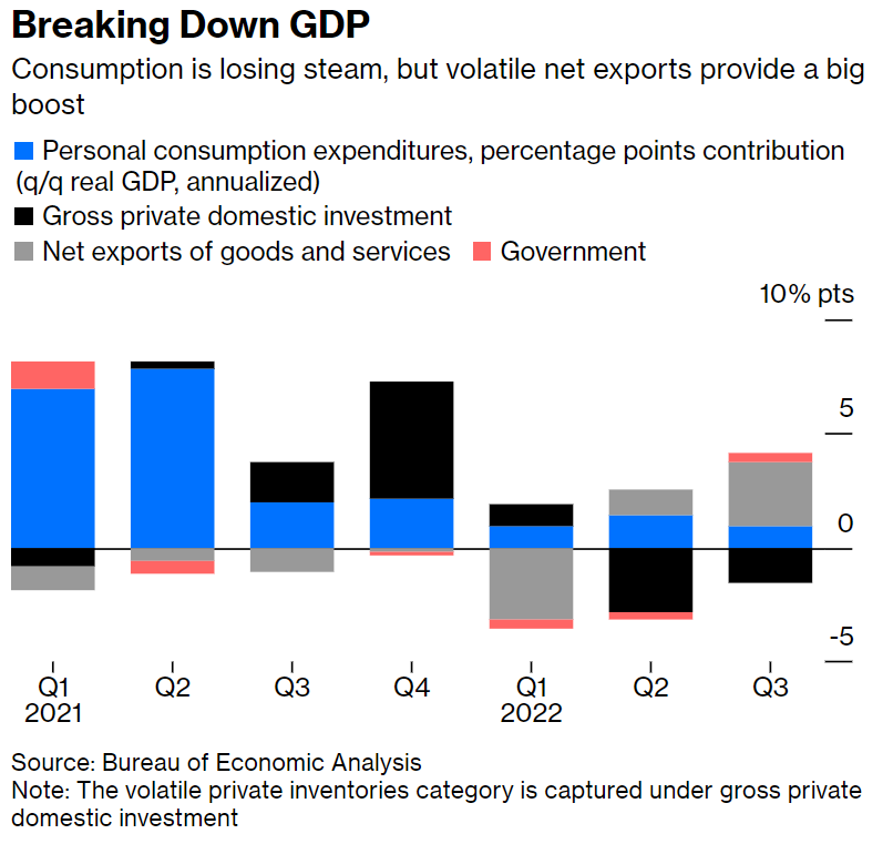 However, breaking down the GDP components shows that GDP grew higher than expected mainly due to net exports (sharp increase in Q3), consumer spending (partly due to inflation effects) and increased government spending: