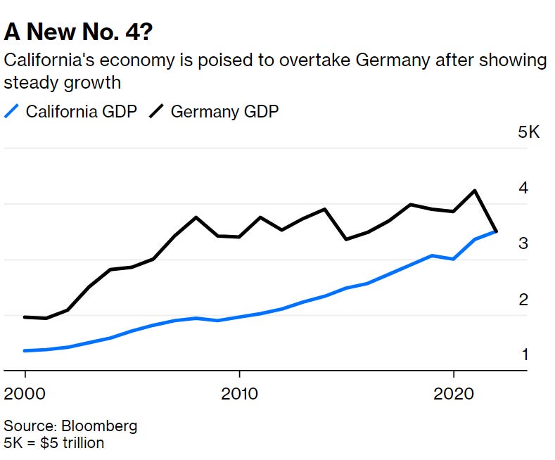 FYI: California's state economy has impressively recovered after the Covid pandemic. Along with the current crises in Europe, America's Golden State is likely to overtake Germany to become the world's 4th largest economy (after the US, China, and Japan).