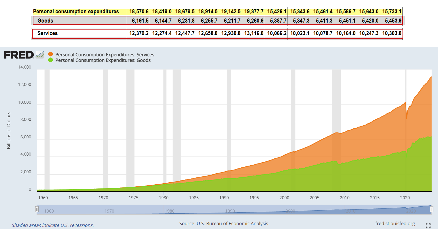Of which, Americans currently spend 2/3 of total spending on services (spending on services is always double spending on goods):