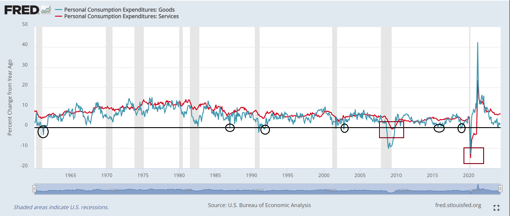 … many periods in the past, negative goods consumption growth still did not cause a recession (black circled areas in the chart below).