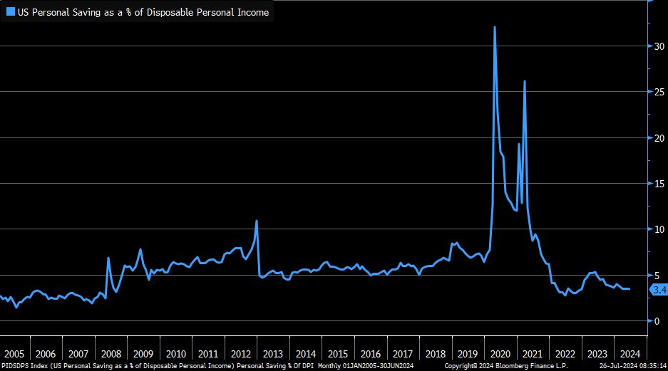 The household saving rate in June continued to fall to 3.4% – indicating that people continue to abandon saving for consumption: