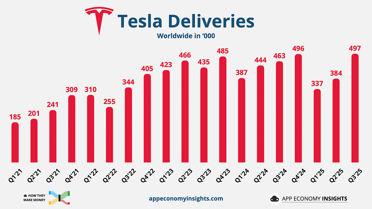 497,000 vehicles delivered in Q3/2025 – a number that seems to signal Tesla's strong return after many volatile quarters.