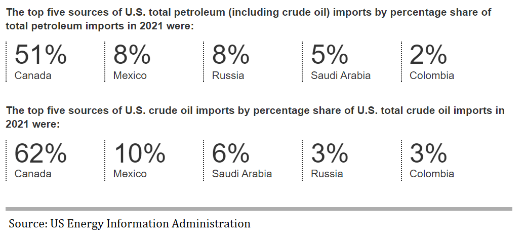 In 2021, Canada supplied 51% of the total US petroleum product imports and 62% of total crude oil imports.