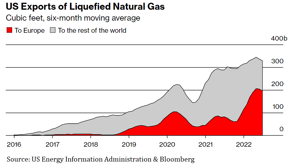 LNG exports (liquefied natural gas) from the US surge, especially to Europe: