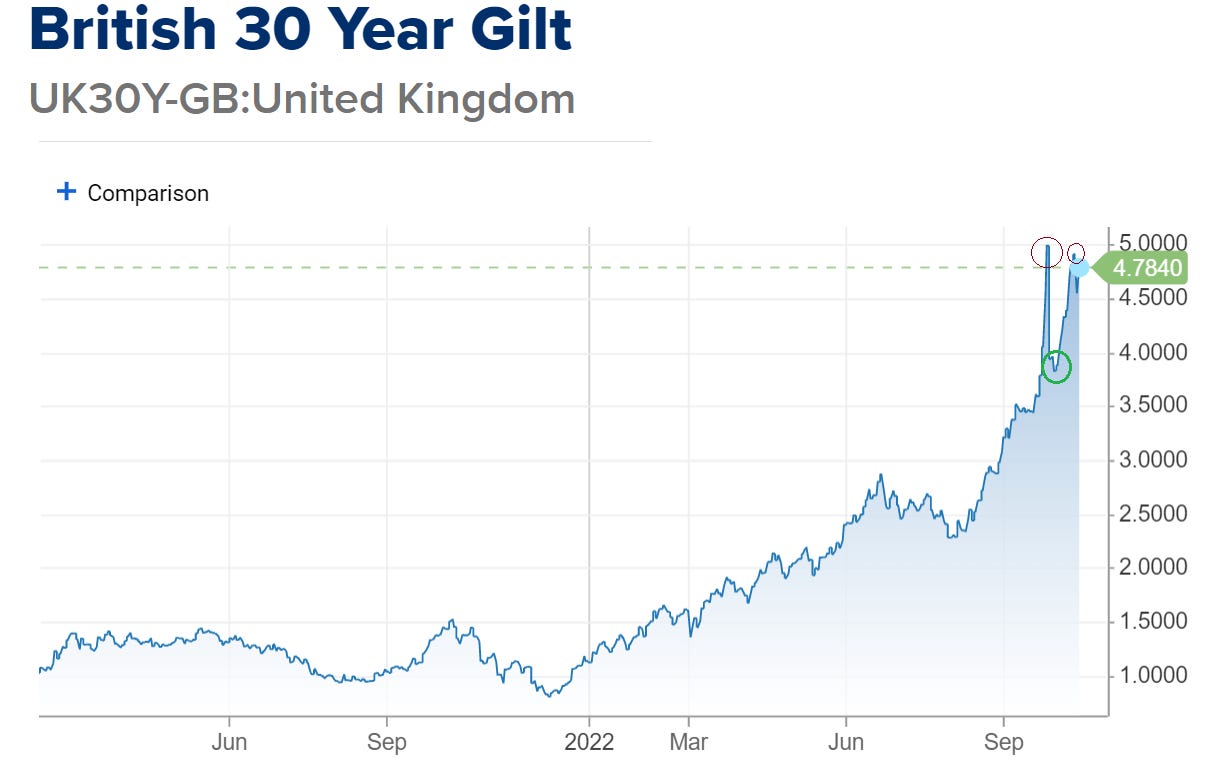 Yields on 30-year UK government bonds (Gilts) quickly rose above 5%, matching the peak of the 2008 financial crisis.