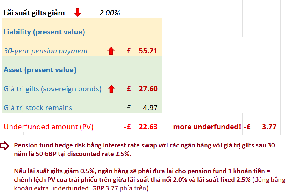 Therefore, UK pension funds use derivative interest rate swap instruments with banks through LDI (Liability Driven Investment) funds to hedge the risk when bond interest rates decrease (to avoid being excessively underfunded on the balance sheet).