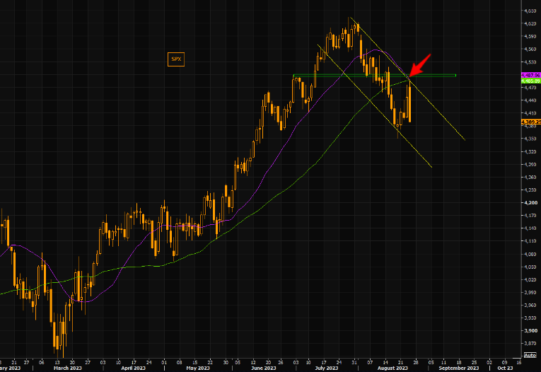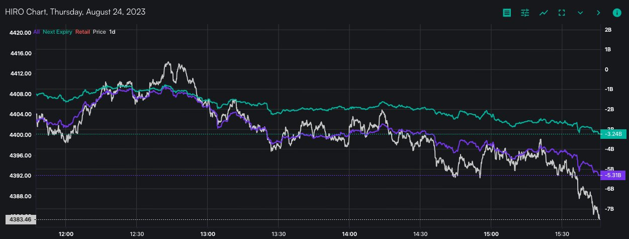 Overall, today's market reaction is somewhat excessive but market fears are real. With pressure from money flowing into puts today, if SPX and QQQ can hold pivots at 4350 and 360 tomorrow, short-dated puts will be forced to roll further out, relieving pressure for market makers to unwind downside hedges and create a small short-cover rally. However, also note Jackson Hole press conference and tomorrow morning at 9:00AM Central.