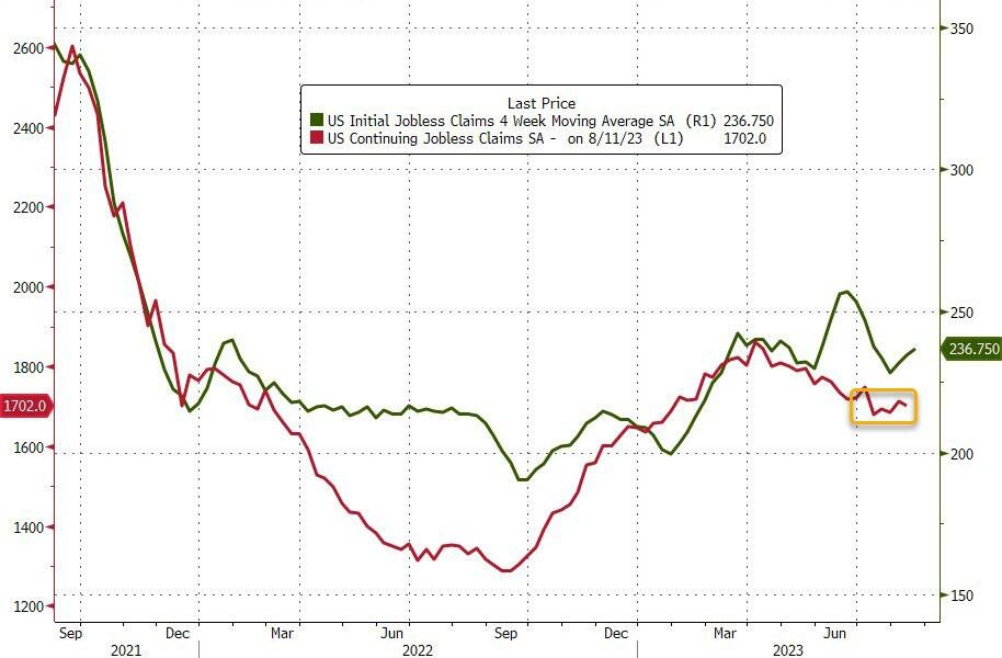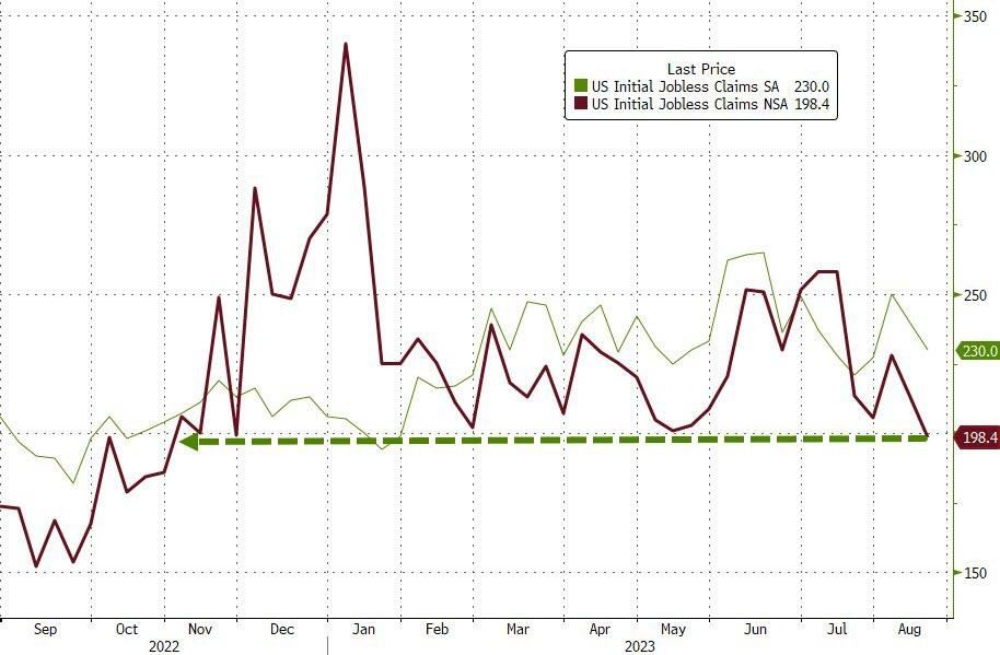 Last week, initial jobless claims fell to 230,000. Excluding adjustments, claims fell to 198,000, lowest since Oct/2022.