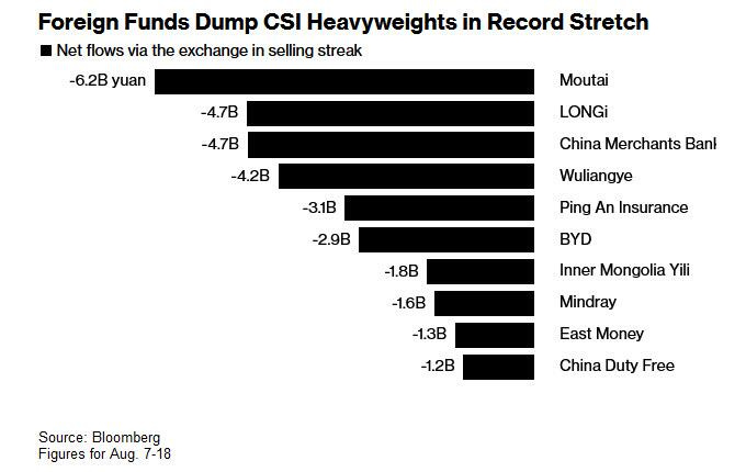 Global investors dumping Chinese blue-chips, showing even industry leaders no longer favored. Moutai stock sold 6.2 billion RMB (851 million USD), most sold stock.