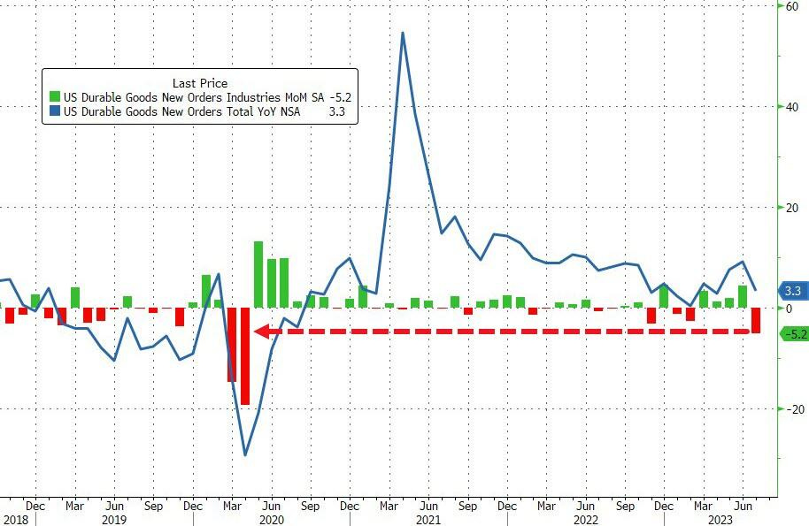 After June's surge, durable goods orders fell sharply -5.2% from previous month, largest drop since Covid.