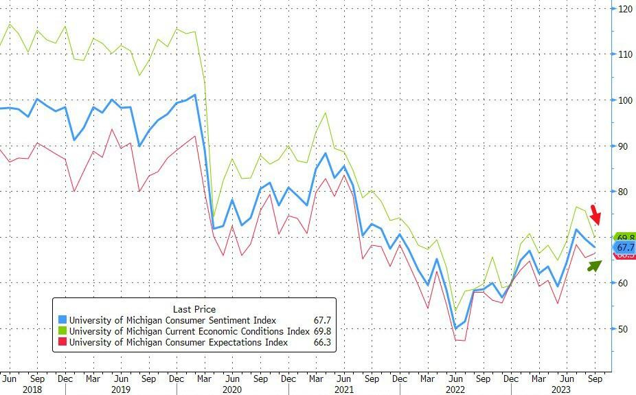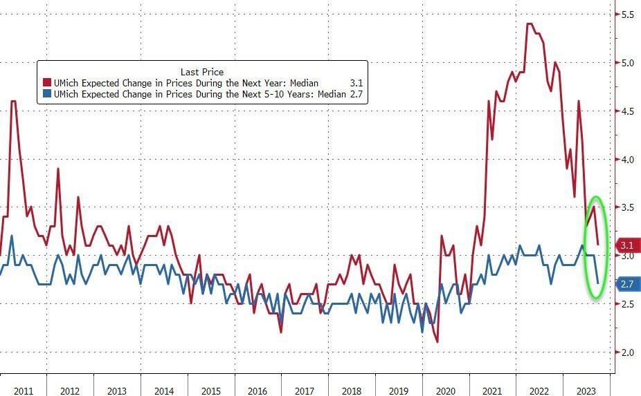 According to University of Michigan survey, inflation expectations dropped sharply to 3.1% as consumers became more optimistic about economic prospects. This is the lowest since early 2021. The 5-10 year ahead inflation rate is 2.7%, lowest since late 2020.