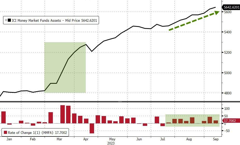 Large capital flows continued into money market funds (17.7 billion USD) last week as banks demanded more from the Fed's Emergency Fund, pushing total assets to a record high of 5.642 trillion USD, marking 8 consecutive weeks of increases.