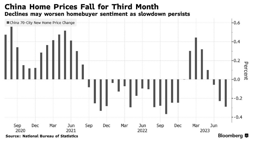 Meanwhile, new home prices in 70 cities, excluding state-subsidized housing, fell sharply 0.29% mom. Real estate investment and home sales remain weak, threatening overall economic growth.