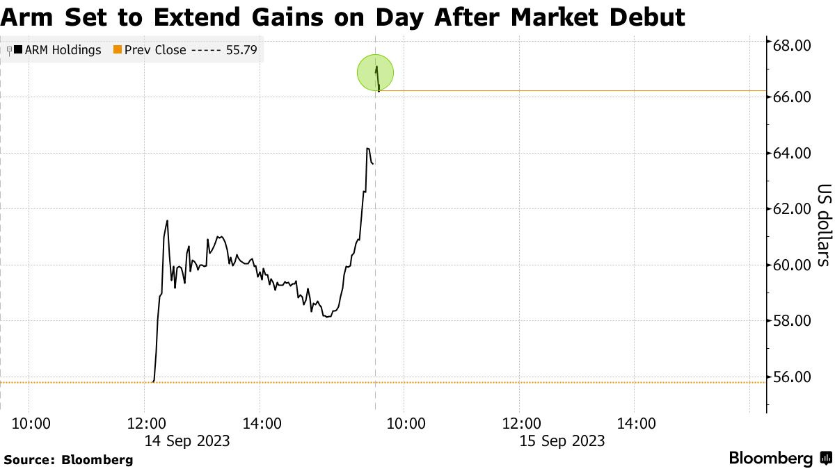 Chip company Arm (owned by Softbank) shares up 25% on IPO debut after raising 4.87 billion USD, up 6% on second day.