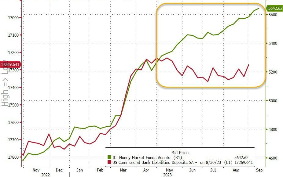 Although there was a relatively large withdrawal from banks last week, the gap with money market fund assets remains very large.