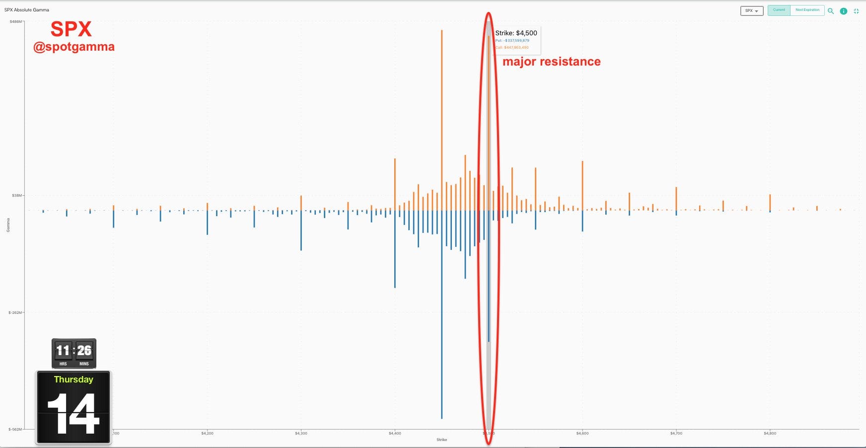 SPX continues to hold the important put wall level below at 4450. Currently, this is the key level determining bias until next week's FOMC with little support below 4450.