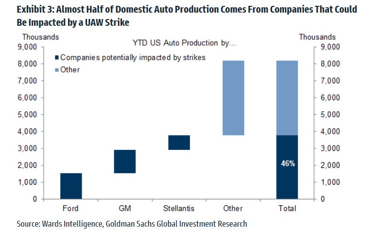Union of Auto Workers (UAW) officially launches strike today with 12,700 workers from Ford, GM and Stellantis, affecting 46% of total US auto production.