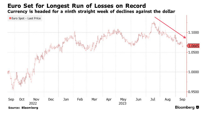 Euro hits record low down 5.6% vs USD, marking 9 consecutive weeks of decline after ECB rate hike.
