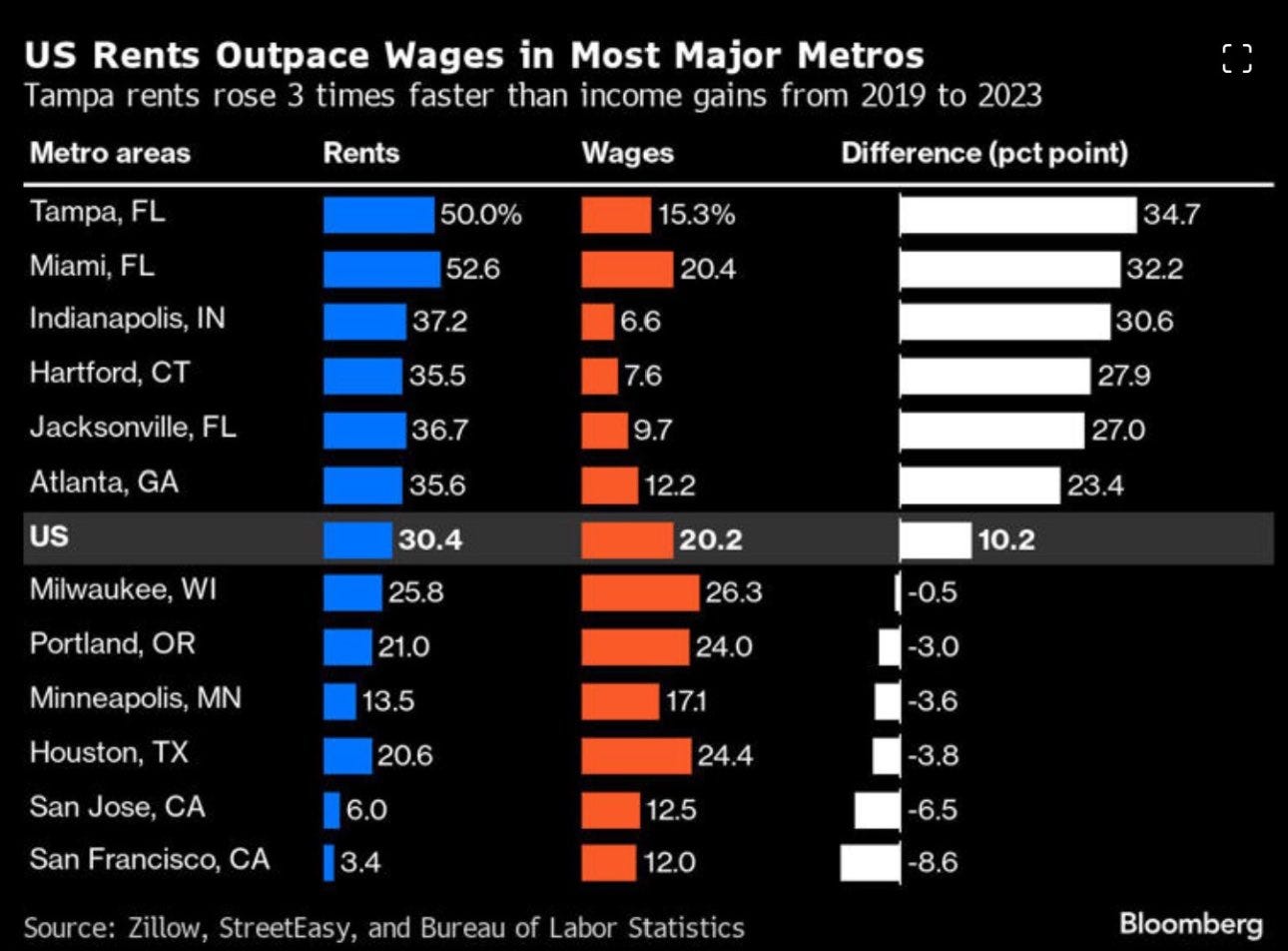 For renters: rent growth also exceeded wage growth in 2019-2023 in most major urban areas in the US: