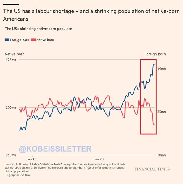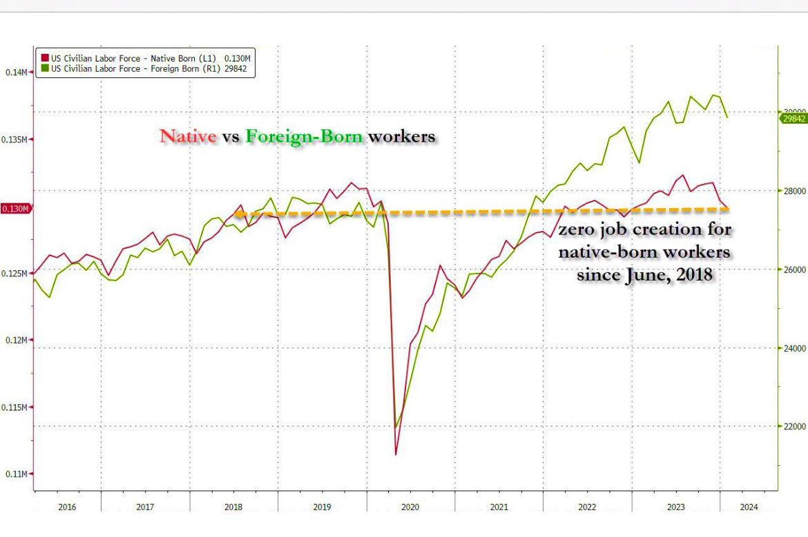 Native population (born in the US) has decreased from 170.8 million (July 2023) to 168.2 million (as of March 2024). ~ decrease of 2.6 million population in just 8 months.