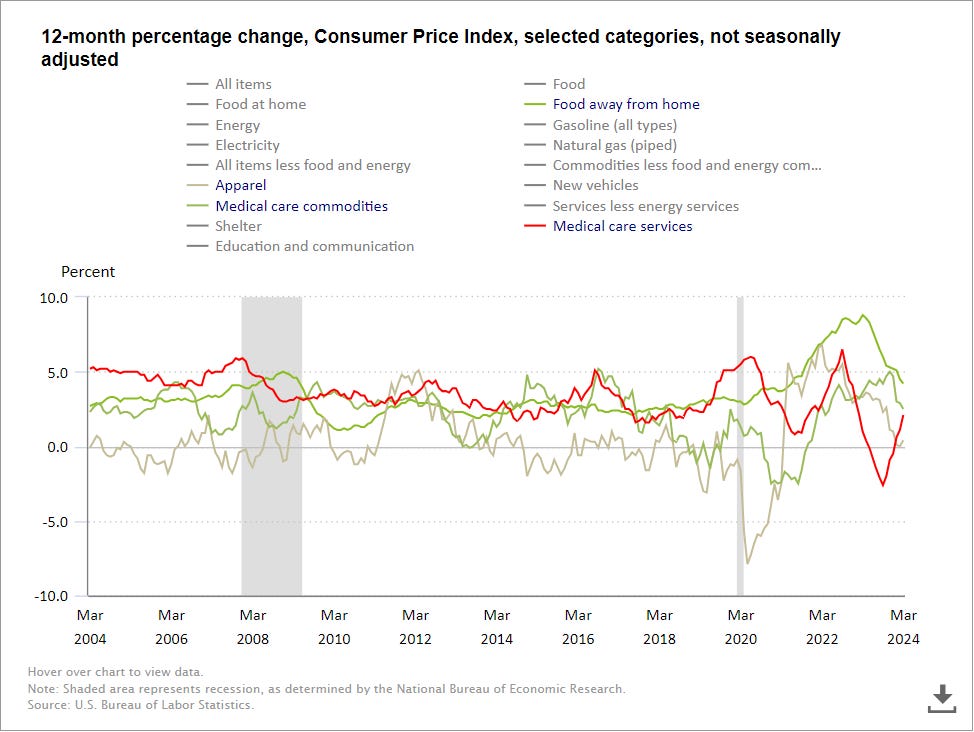 Most essential costs such as food (at restaurants), clothing, and healthcare remain high or are rising again.