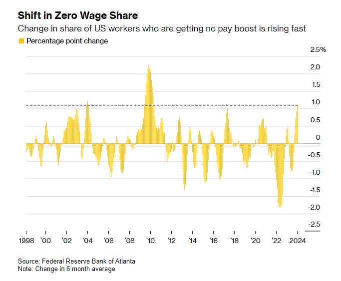 However, the bad news is that the rate of US workers being held back on wages / skipped raises is increasing (Atlanta Fed)
