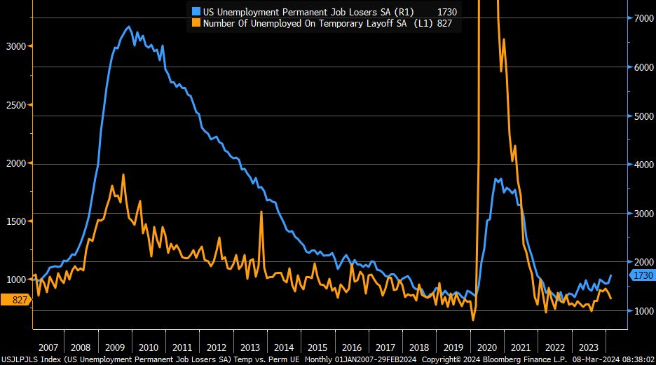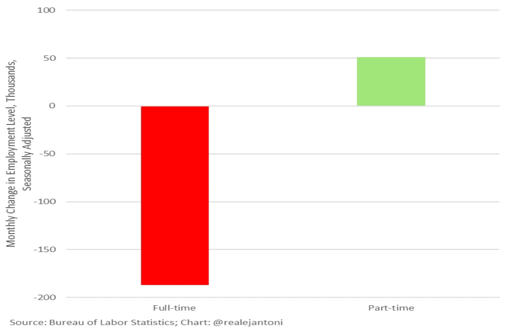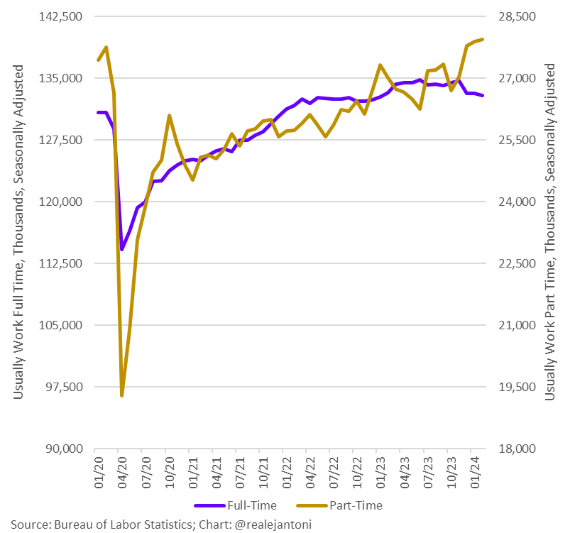 Even in February, full-time jobs fell by -187,000; while part-time jobs only increased +51,000 (seasonally adjusted).