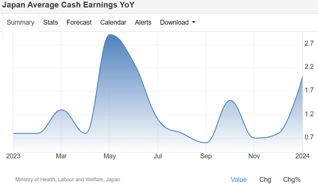 Japanese people's cash income increased +2% y/y in January (a remarkable increase compared to December: +0.8% y/y and forecast +1.2% y/y).