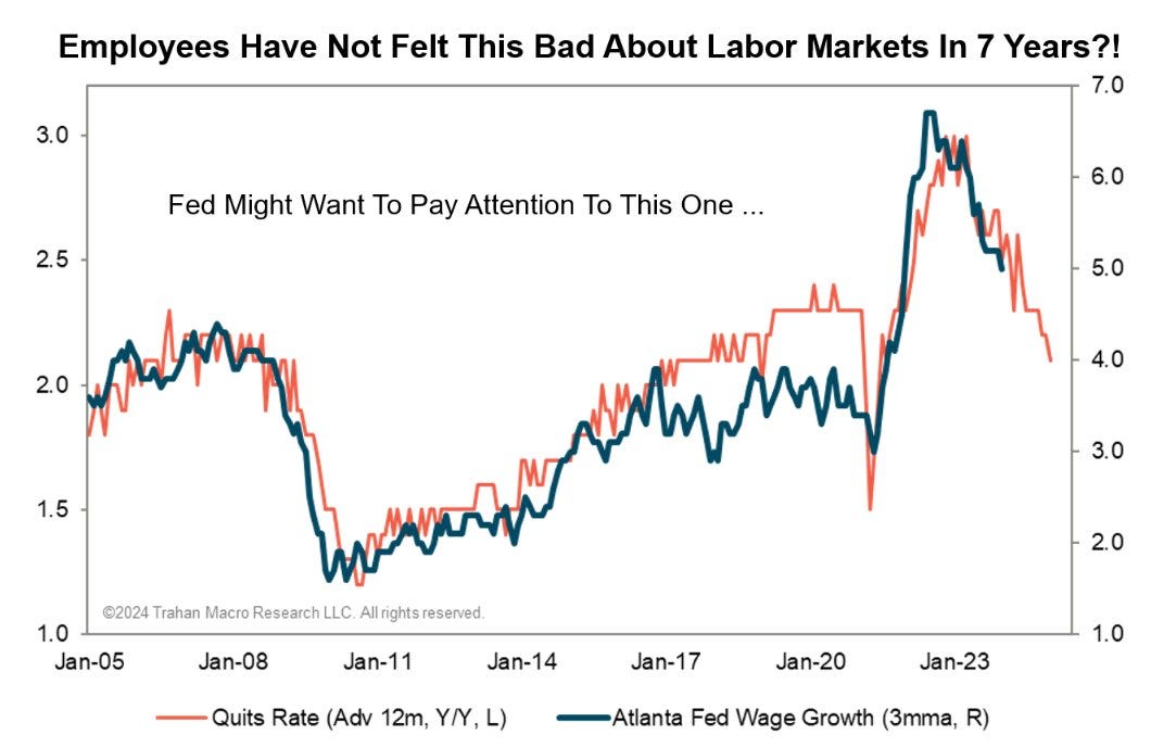 The quit rate (a measure of labor market tightness) has now fallen to pre-pandemic levels..., ~ the reason helping wage inflation normalize (above).