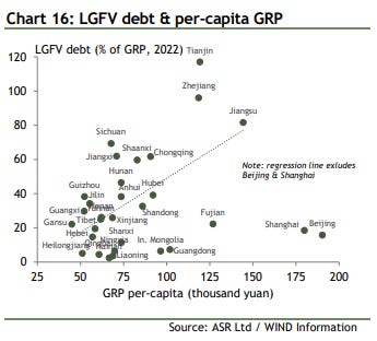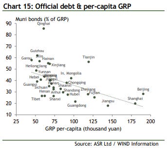 In contrast to the official debts on the balance sheet (local government bonds) allocated in a seemingly 'humane' way: poorer provinces have higher borrowing levels (on the balance sheet).