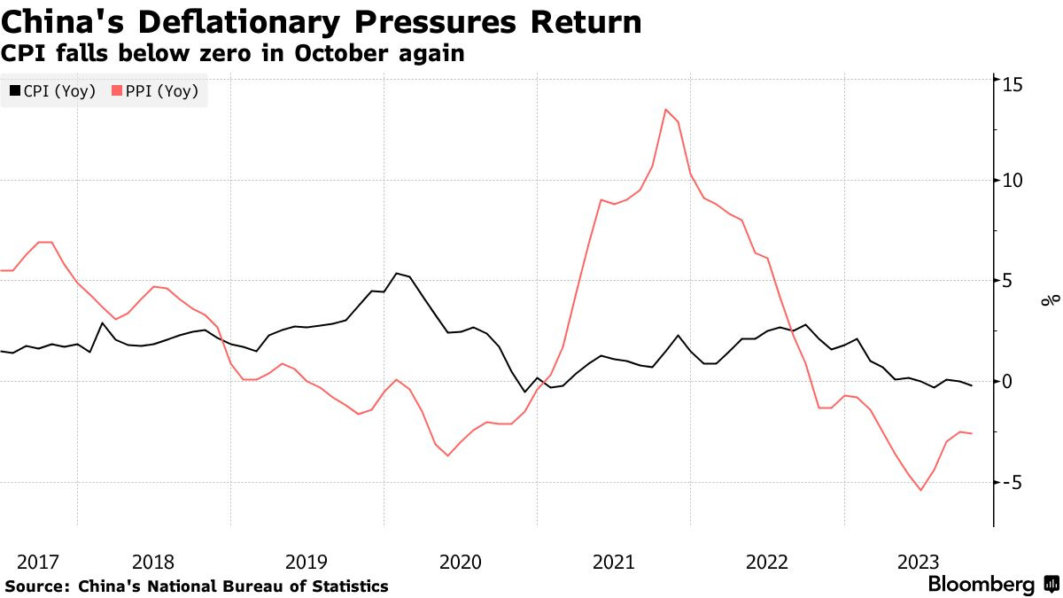China's CPI fell to negative territory again (-0.2%) in October 2023. Meanwhile, PPI has remained negative throughout the past year.