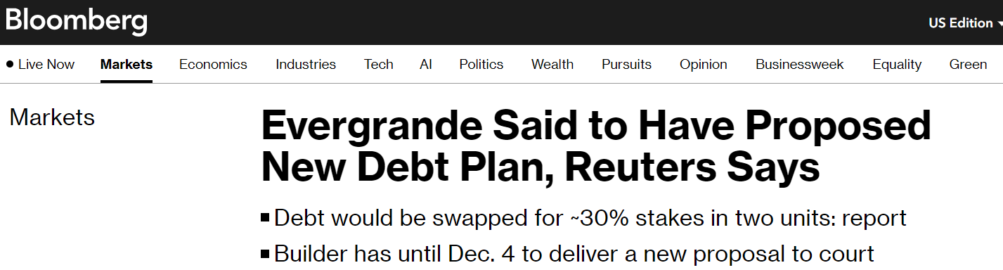 Evergrande proposed to foreign creditors to swap debt for 30% equity.