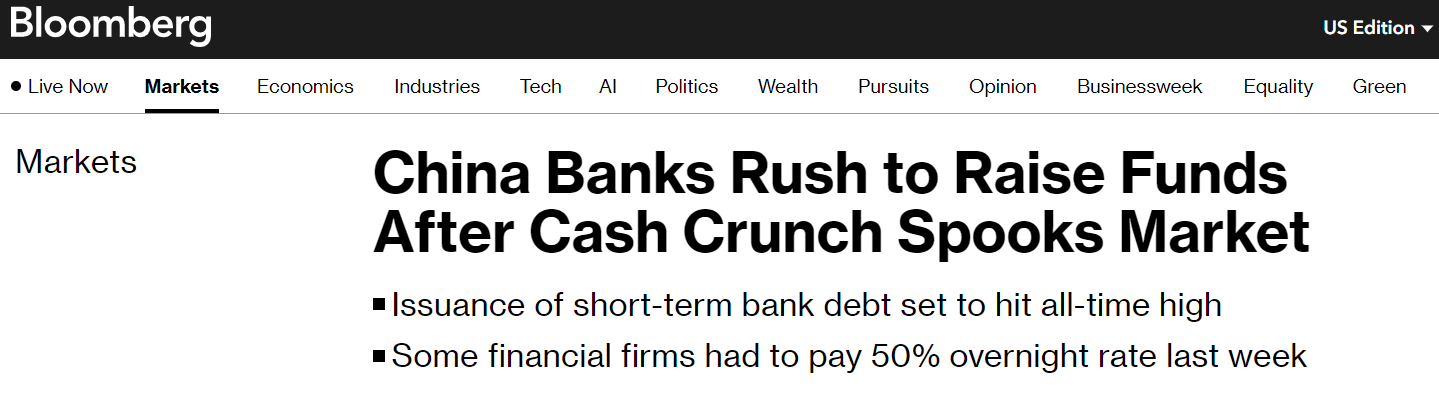 In the context of cash shortages in China's financial market and this country running a deficit in foreign currency revenues from abroad (both from exports and FDI), upcoming US Treasury bond sales will be intensified even more.