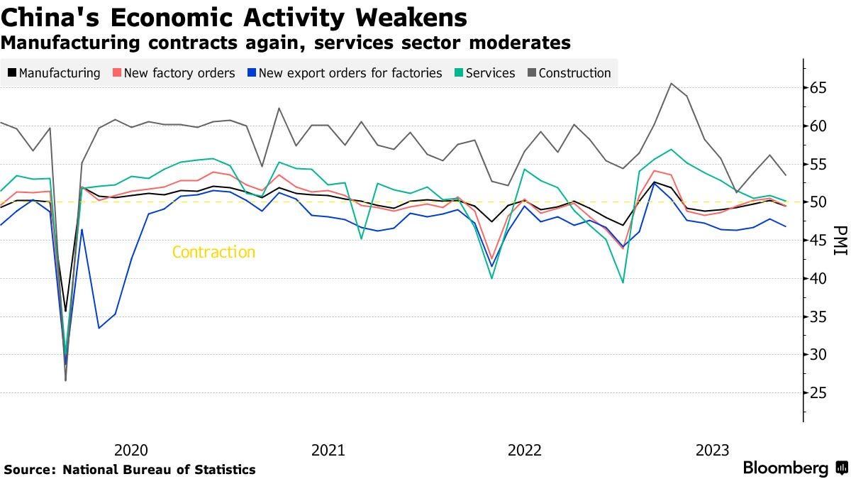 The retreat in China's economic production activity is evident: PMI for all sectors declined in October 2023.