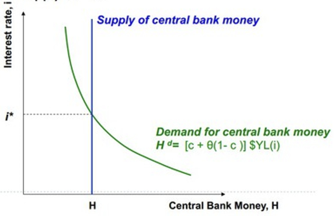 In equilibrium, base money supply from the Central Bank = market demand for base money.