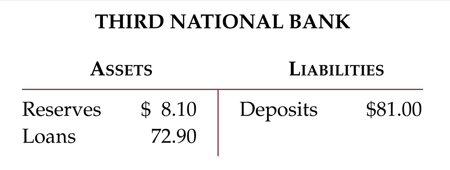 The $81 loan from Second National Bank continues to be deposited at Third National Bank through the transaction process, still with a reserve ratio of 10%.