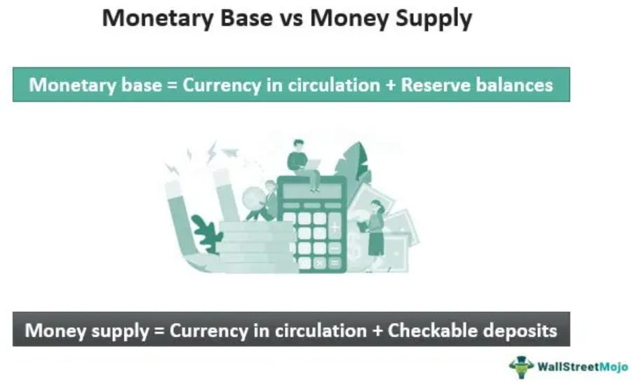 Base money differs from money supply (= currency in circulation + deposits at banks and CBs)