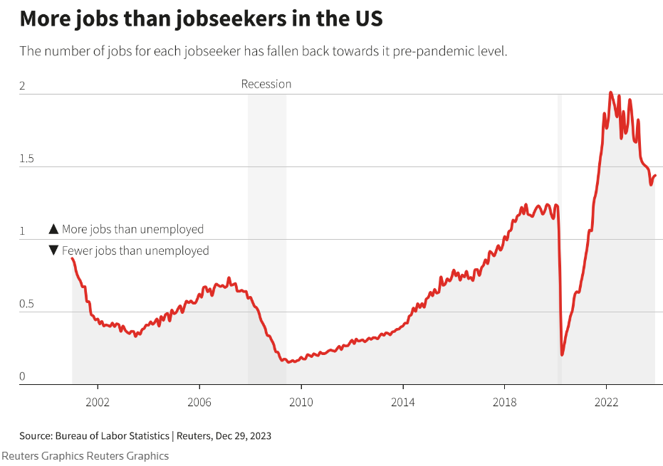 Although lower than 2022 (wages up >5% y/y), current wage growth rate + high post-Covid labor demand (figure below) is just enough to help the economy and labor grow at a modest pace - achieving soft-landing in 2023.