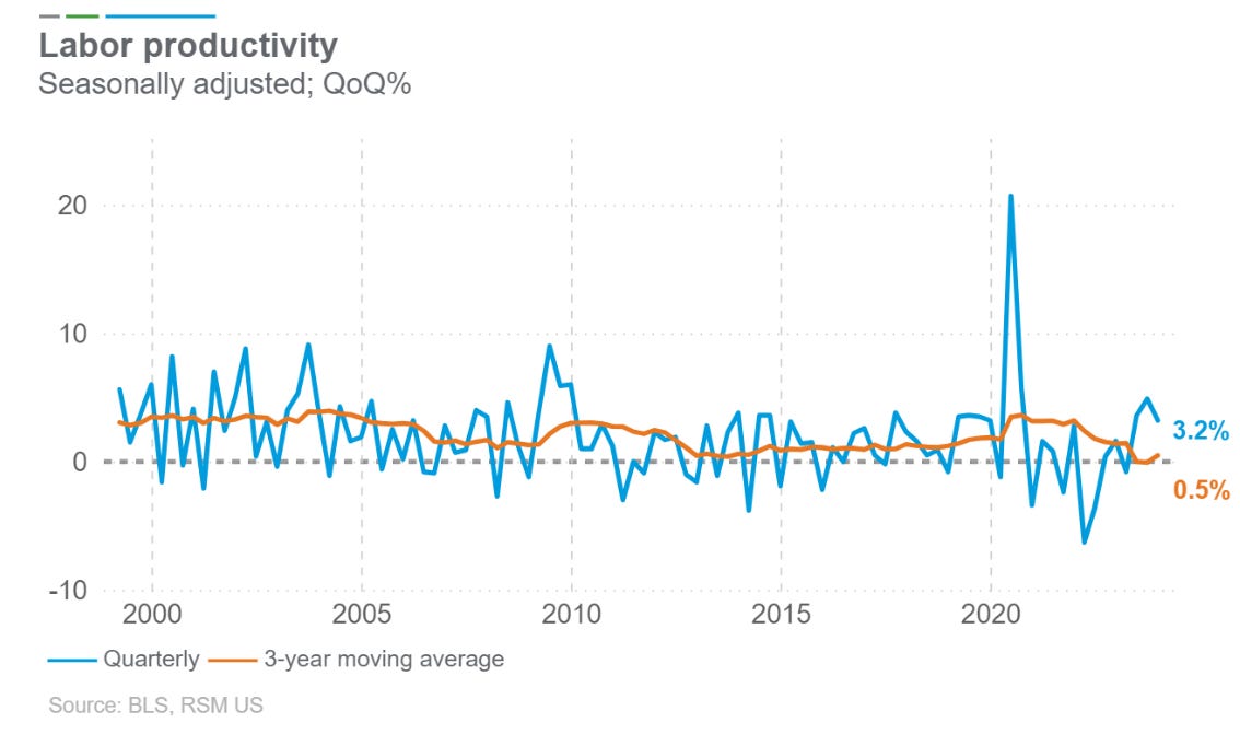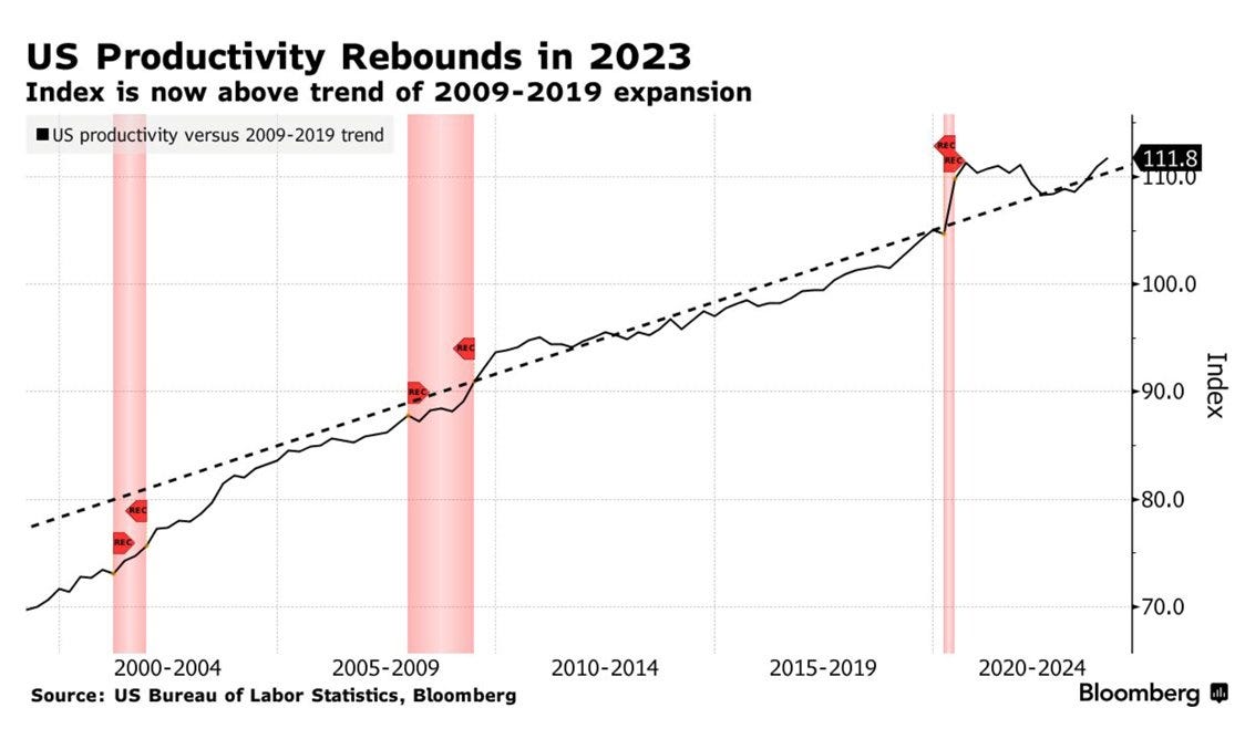 US labor productivity increasing higher than the general trend since after Covid is something that did not happen throughout the 10 years before Covid: