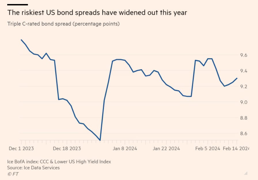 Yields on corporate bonds with low credit ratings rose again from after the first week of January 2024 compared to the end of December 2023.