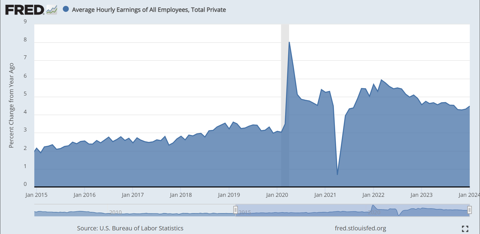 Hourly wages increasing at >+4% y/y rate throughout 2023 to date