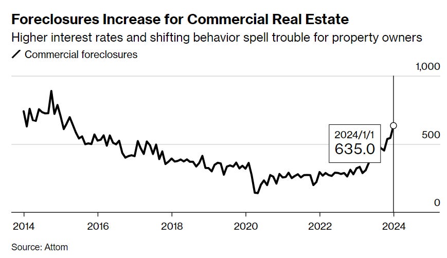 635 commercial properties were foreclosed in January 2024 because owners could not pay debt: up +17% m/m and +97% y/y
